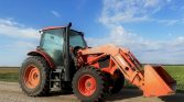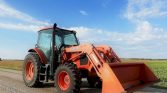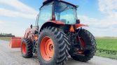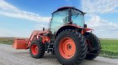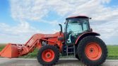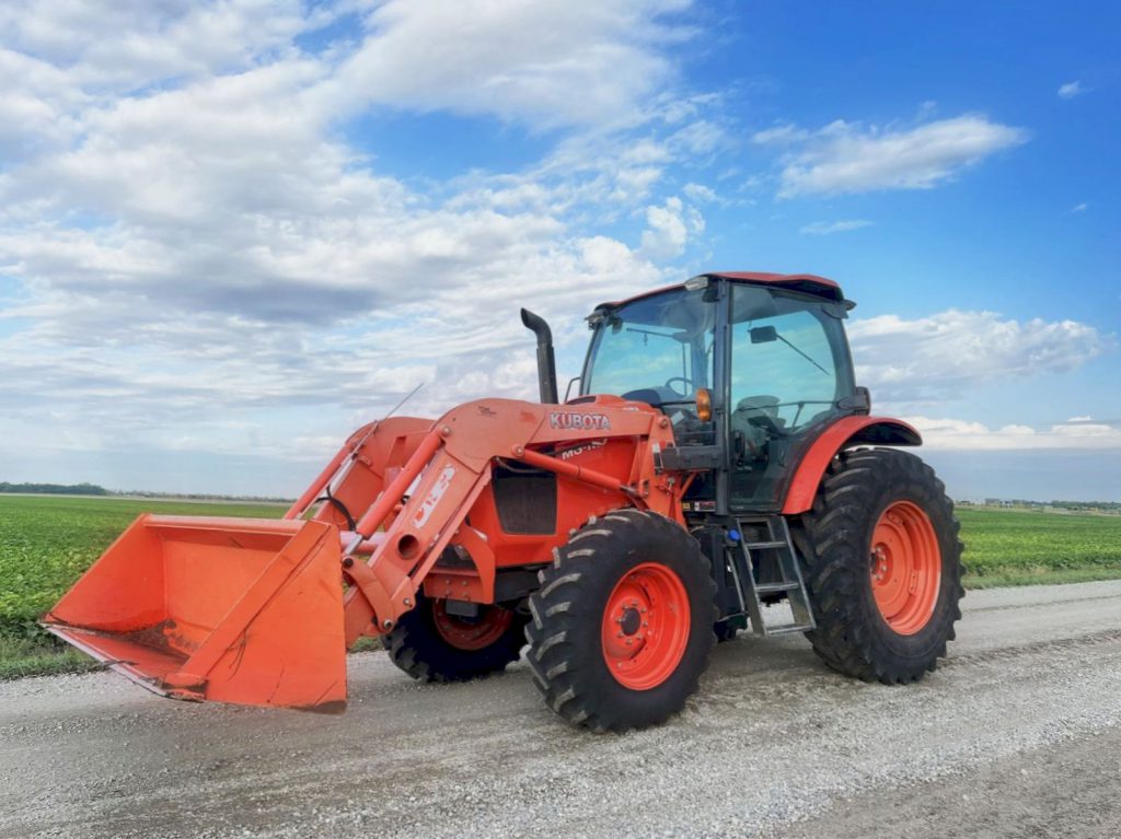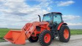 Kubota M6-111 MFWD 106hp tractor with Kubota LA1955 loader, enclosed cab with heat and A/C. Rear PTO, 2 remotes, 3 pt, drawbar. 469 original hours. Excellent condition, very clean. Strong engine and runs great.